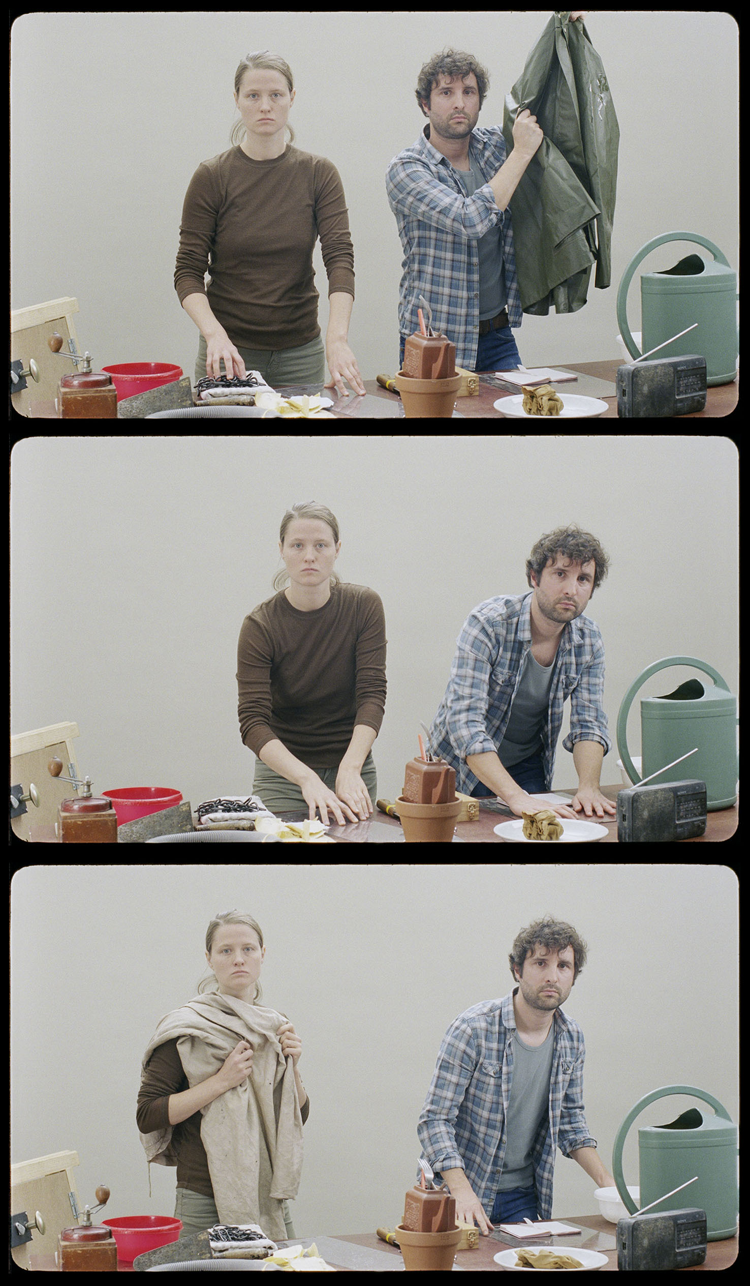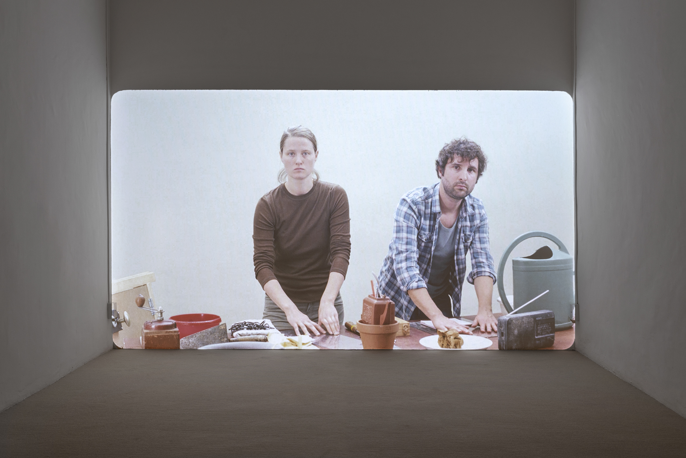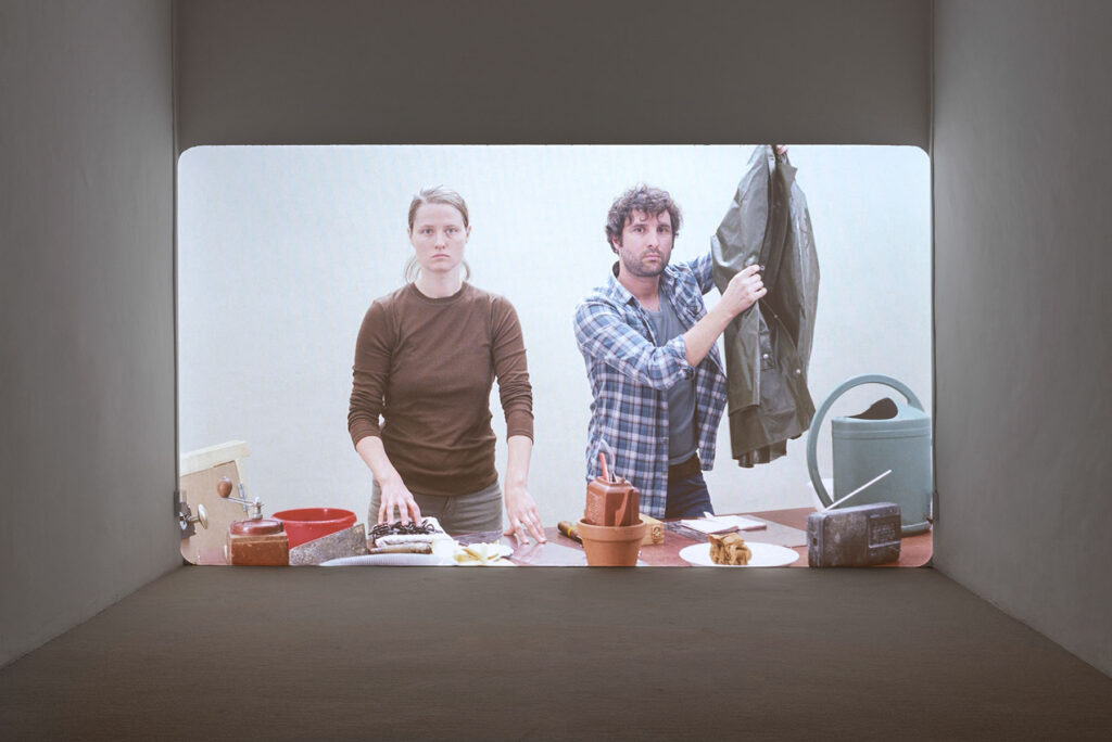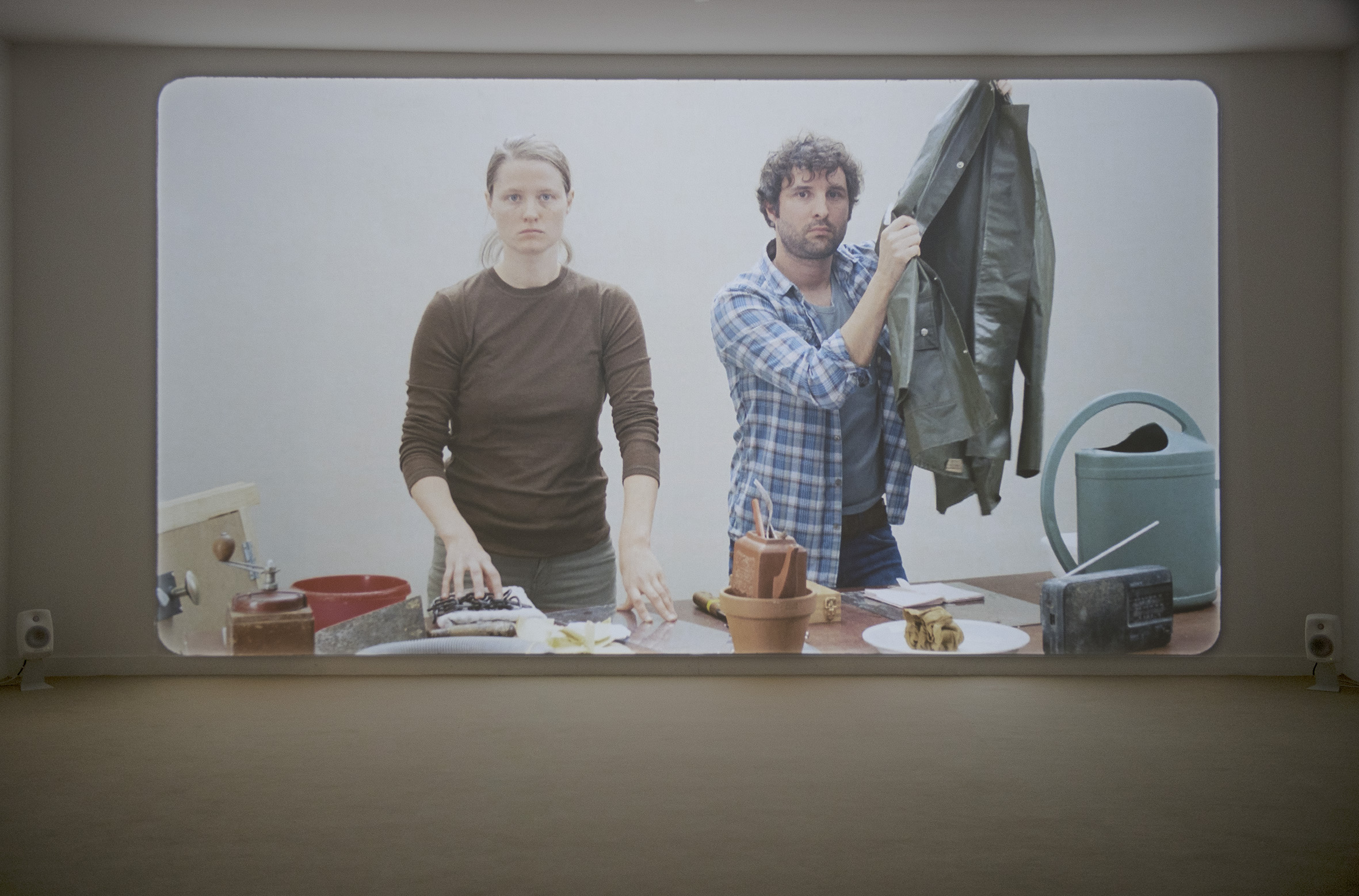 “..In Arr. for a Scene we are thrown into action that we have to try to decipher–first from the images, out of pure habit, and increasingly from the sounds. Two parallel stories are playing out for us. One is an enigmatic stage. The other is one of the most famous horror scenes in the history of film. Until the moment of recognition, we remain simply viewers of the image. Two people prepare by adjusting the objects in front of them; then, they carry out a series of more or less mundane and quite unremarkable actions. No words are spoken, no music played, they are in a state of complete concentration. Increasingly, though, this seemingly undramatic scene becomes almost uncomfortable for us as viewers. Both people’s facial expressions are blank: they’re looking right at us, but it is also as if they’re looking through us. We see how the sounds are being made, yet we aren’t certain what we are seeing…”